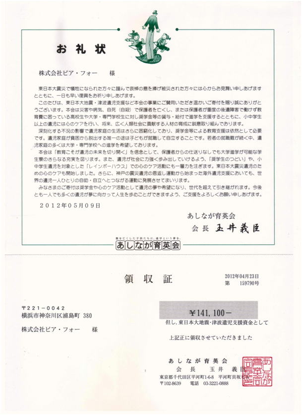 株式会社ピア・フォーは、東日本大震災において、特に津波被害により多くの子ども達が家族を亡くしている現状を受け、同じ港町である横浜から、皆の想いを一つにして子ども達の応援が出来ないかと考え、『あしながクルーズ』を運航し、乗船料を「あしなが育英会 東日本大地震・津波遺児支援募金」へ寄付しています。